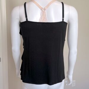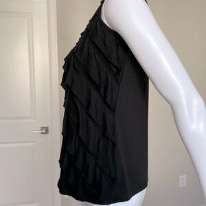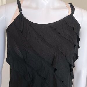 Black spaghetti strap tank with adjustable straps. Has diagonal ruffles running down the entire front side. Fabric underneath ruffles is a semi sheer subtle lace. Great comfortable top with a lot of movement and flirtiness. Staple in every girls wardrobe