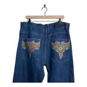 These vintage jeans are accented with embroidered details, giving them a unique touch. They have a stretch gusset style, making them comfortable for everyday wear. These pre-owned jeans are perfect for men who want to add a stylish and timeless piece to their collection.