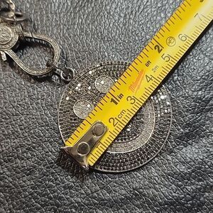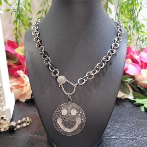 This Necklace has all the sparkle and shine wrapped up into an adorable Smiley Face charm. Charm is part of the hammered gunmetal chain. Secures close with a oversized lobster clasp that also has Black diamonds encrusted into it. This piece is absolutely beautiful.