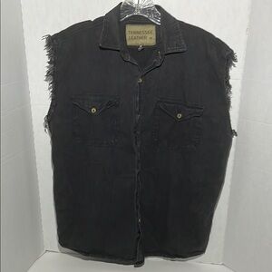 This black denim vest features a rugged, distressed look with raw, frayed edges for a vintage appeal. Made from heavy denim, it offers a classic sleeveless design perfect for layering and adding a touch of rock-style to your outfit.
