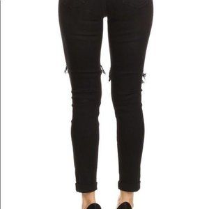 Black denim ankle skinny fit jeans with mid rise, big hole, ripped detailing, and roll-up cuffed hem.