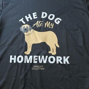 This black t-shirt features a humorous design with the text 'THE DOG ATE MY HOMEWORK' alongside a light yellow dog silhouette. Made from comfortable fabric, it's perfect for dog lovers who enjoy a good laugh. The playful graphic makes it a fun addition to any casual outfit.