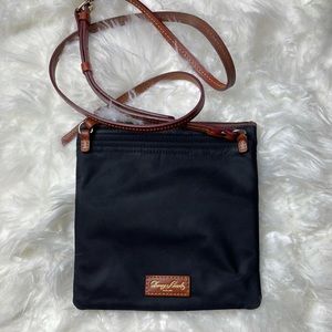 This gorgeous black nylon and brown authentic leather Dooney and Burke crossbody bag features 3 separate zipper areas and a hot pink interior. It is durable and can easily be dressed up or down.