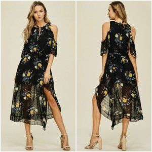 Beautiful, airy cold shoulder woven dress with floral print and dot embroidery fabric. It has a round neck with a front tie, bell sleeve and elastic waist.