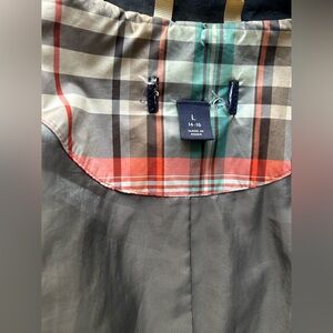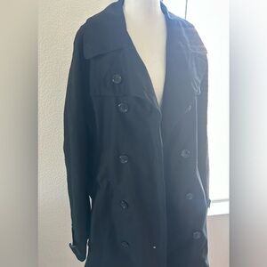 Stylish black double-breasted trench coat. Features classic button details and adjustable cuffs.