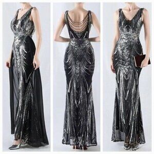 Black and Silver, Detachable Draped Skirt, Two Styles in One Dress,Draped Beaded Back, Double V, Contrast Sequined and Contrast Mesh Mermaid Maxi Formal Gown for Special Events