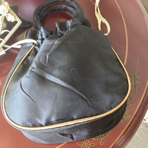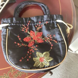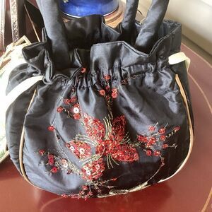 Black “silky-feeling” fabric bag with gorgeous red sequins in a floral design. Double handles with drawstrings. Measures 8” tall, 8 1/2” wide and 2 1/2” gusset. Gold line inside. Excellent condition.