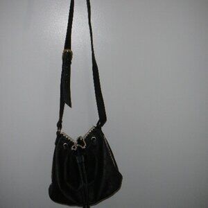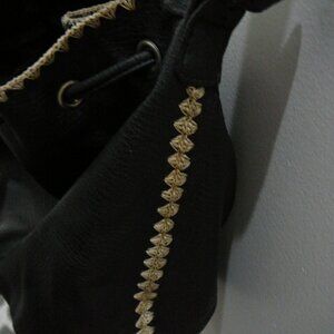 Black Drawstring Closure Cross Body Faux Leather Purse Bag w/Tan Embroidery