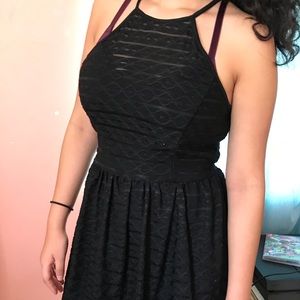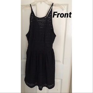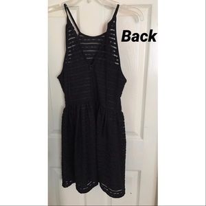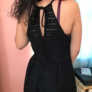 Black flowy dress. Has a zipper in the back and has strings that tie in the back also.