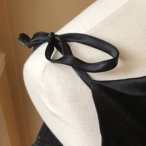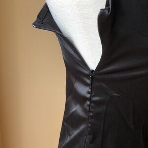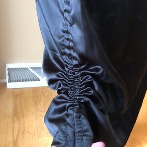 Silky black dress with ruching on sides so you can make the dress shorter. Side zipper makes getting into it easy. Tie straps on the shoulders. Perfect for semi formal occasion or evening out.