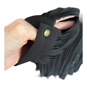 Black dress plus sizs 4XL accordian pleated throughout with long accordian pleated sleeves and button cuffs. Attractive ruffled neck. 1“+ horizontal waist panel. Knee length. 95% polyester, 5% lycra. Hand wash or dry clean. Imported