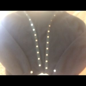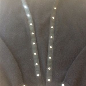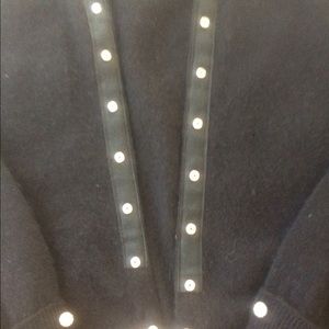 This is such a pretty Dressy Sweater Cardigan that you can wear a shell under and be ready for a Dressy Occasion. It has Silver studs down the front and Rhinestone On Sleeves and front closure. Has a Cashmere feel to it. Material tag not on garment. Retailed for $129