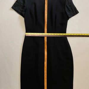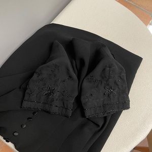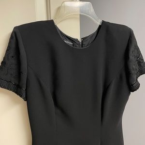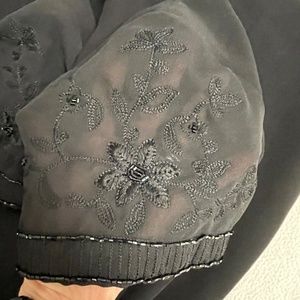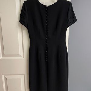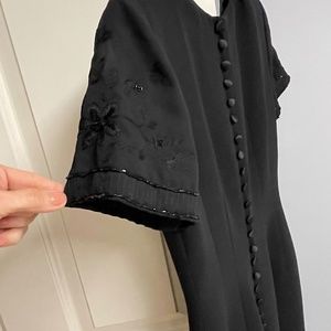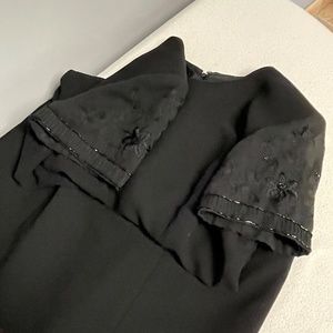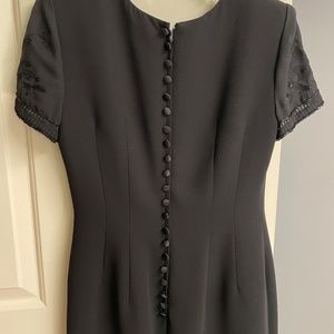 *Pre-owned elegant black dress with shear beaded sleeves. Back has 21 satin covered buttons which hide a zipper. Fully lined. Small slit in the back of the dress.