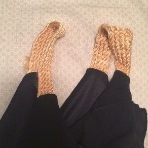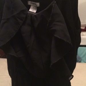 Black dress with ruffles on front. Gold straps with somewhere between a boat neck/scoop neck. Back side is v-shaped. Straps are a bit worn (pictured) but otherwise in good condition.