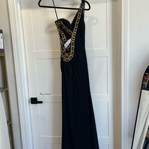 Chic black dress with bold gold chain accent. Perfect for evening wear.