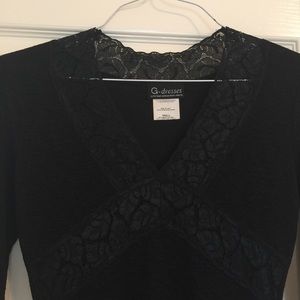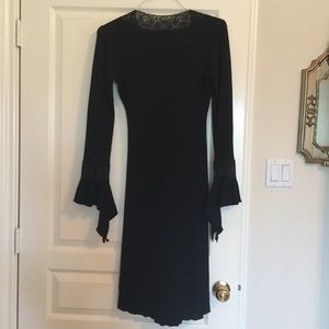 Long sleeve dress with lace embellishments around neck, chest, and bottom of sleeves
