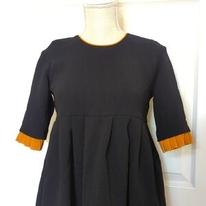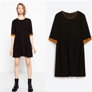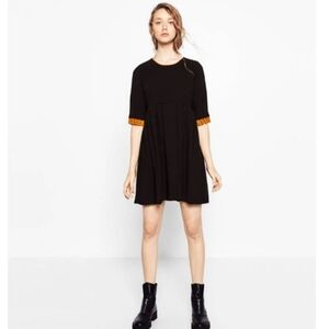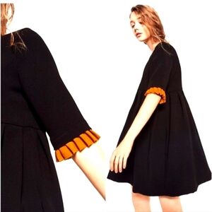 Elegant black dress featuring orange ruffle sleeves. Perfect for any occasion.