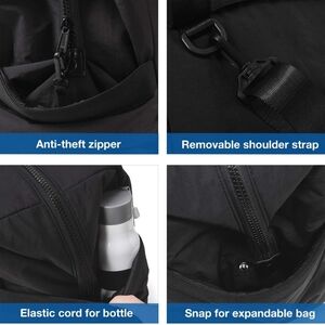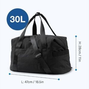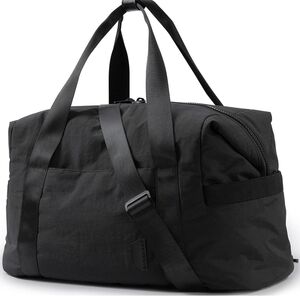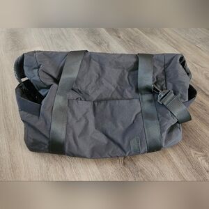 Sleek and versatile black duffel bag, perfect for travel or gym use. Durable design with ample storage space.
