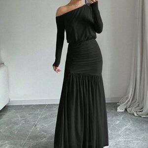Black Elegant Women's Asymmetrical Neck long sleeved maxi Dress