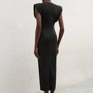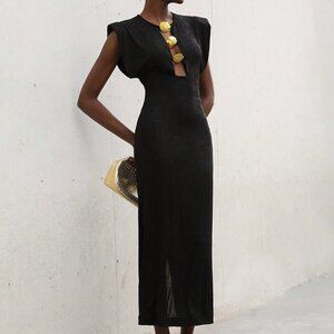 Black Elegant Women's Bodycon Long Dress Puff Sleeves Crew Neck