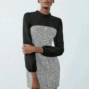 Black Elegant Women's Button Decor Chiffon Patchwork Lantern Sleeve Dress