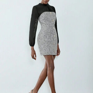 Black Elegant Women's Button Decor Chiffon Patchwork Lantern Sleeve Dress