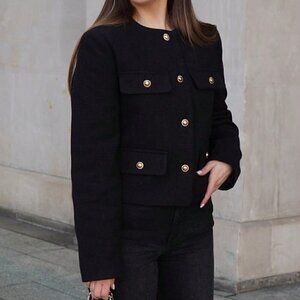 Black Elegant Women's Casual Tweed Jacket Decorated Long Sleeve Coat