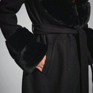 This elegant women's coat is a long, wrap-style design with a faux fur fluffy shawl collar. It has a loose fit and a beautiful waterfall neckline. Made in a plain pattern, this long sleeve coat is perfect for winter, providing both warmth and style.
