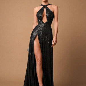 Black Elegant Womens Glitter Sequin Party Dress with Hollow Tie-Up Design & Slit