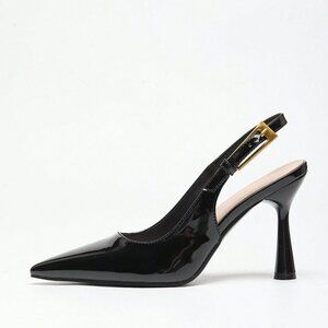 Black Elegant Women's High Heel Pointed Toe Button Lacquered Leather Slingback P