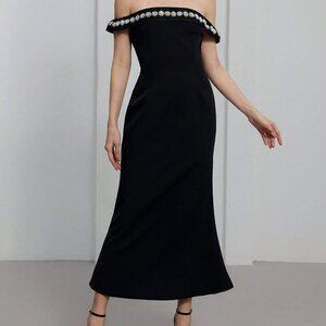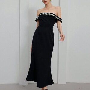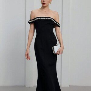Black Elegant Women's High-End Long Dress With Beaded Off Shoulder