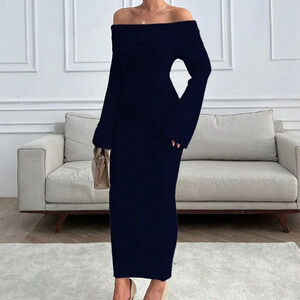 Black Elegant Women's Off Shoulder Sweater Maxi Dress Slim Fit