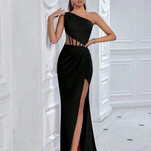 Black Elegant Women's One Shoulder Waist Hollow Out Front Slit Party Dress