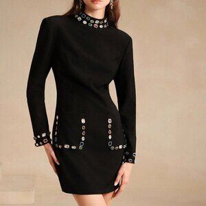 Black Elegant Women's Rhinestone Embellished Long Sleeve Short Dress