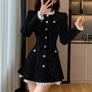 Black Elegant Women's Sequin Tweed Spliced Pleated Single Breasted Mini Dress