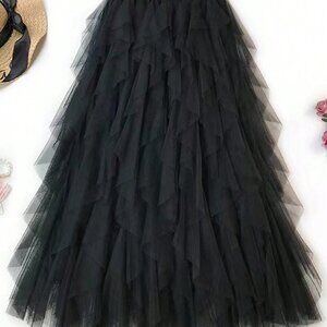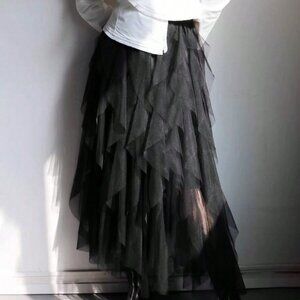 Black Elegant Women's Textured Asymmetric Mesh Tulle Skirt
