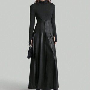Black Elegant Women's solid upper with Faux Leather bottom Maxi Party Dress