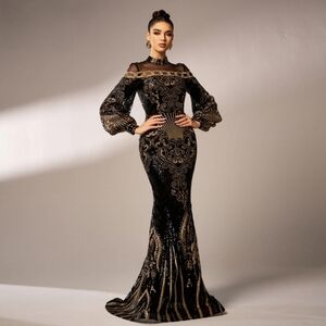 This exquisite black gown is adorned with intricate embellishments, offering a luxurious touch perfect for a wedding or prom. The backless design and bishop sleeves add a dramatic flair, while the mock neck and mandarin collar provide a sophisticated finish.