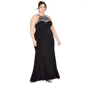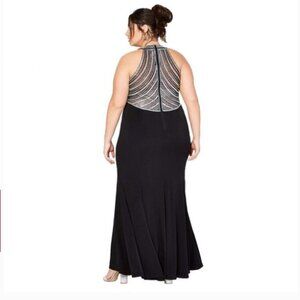 Make a show-stopping entrance in this elegant black floor-length gown from Macy’s. Featuring a high halter neckline adorned with dazzling silver beadwork, this dress is equal parts glamorous and sophisticated. The open shoulder-baring cut and art deco–inspired beaded detailing create a timeless silhouette that flatters from every angle.