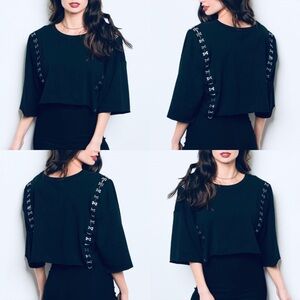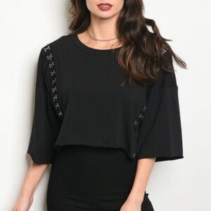 Elevate your style with this chic black short sleeve tee, featuring elegant embellishments for a touch of glamour.
