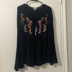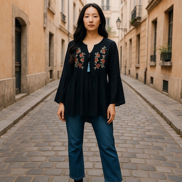 Elegant black top with vibrant floral embroidery. Perfect for any occasion.