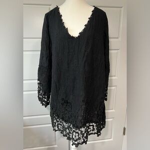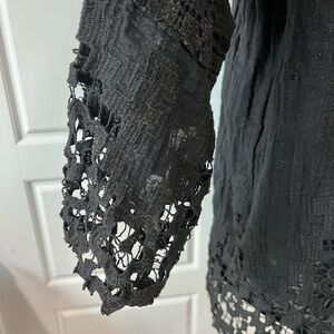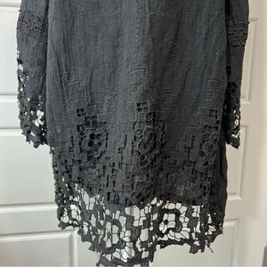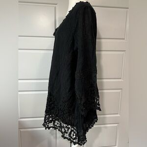 Keywords: black tunic dress, embroidered dress, crochet lace dress, bohemian dress, boho dress, long sleeve dress, black dress, tunic top, lace trim, festival dress, casual dress, beach cover up, summer dress