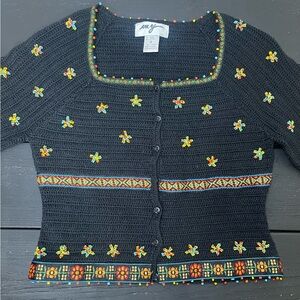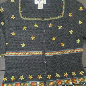 This stylish black sweater by features colorful embroidery, adding a vibrant touch to your wardrobe. Perfect for any occasion. Vintage