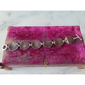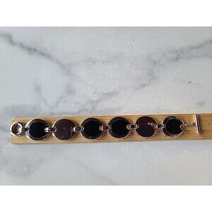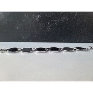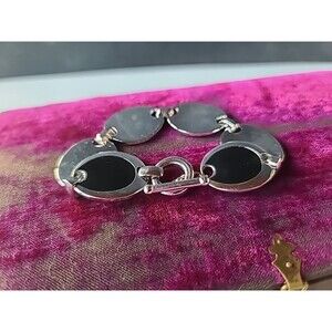 Black Enamel And Silver Tone Metal Link Bracelet With Toggle Closure Vintage