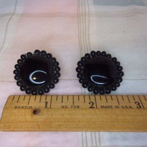 Black enamel button clip earrings with bead halo, marked Japan, look very 1950s, nice condition, pretty vintage earrings.