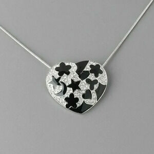 Black Enamel Pave Austrian Crystal Heart Pendant Silver Snake Chain Necklace