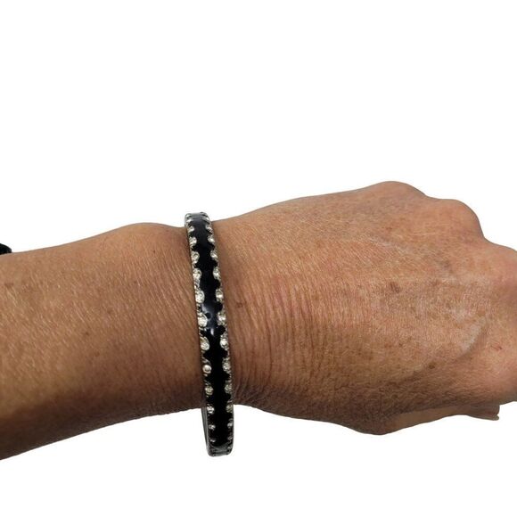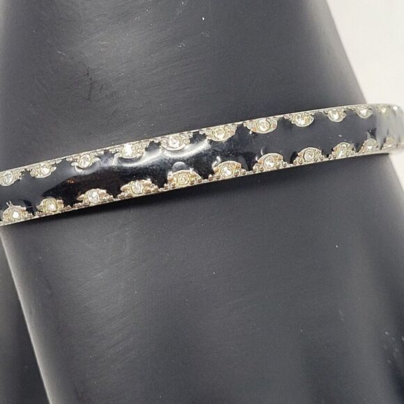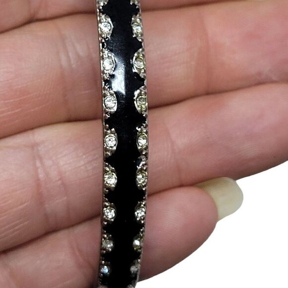 Black Enamel Skinny Metal Bangle Silver Rhinestone Trim Gift Collectible Gothic