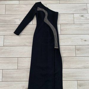 Black evening gown. High slit and sheer down the middle. One shoulder long sleeve.