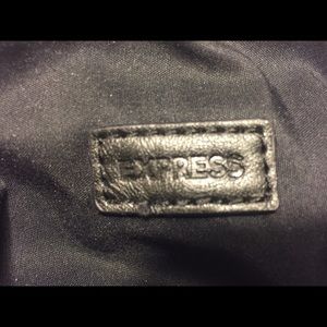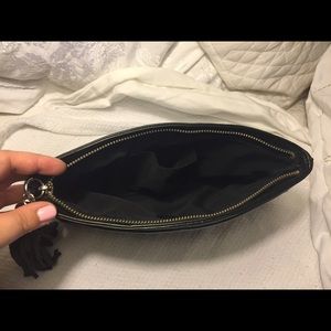 Black (soft, not real leather) Express Clutch with fringe attachment (not removable) on zipper. Used a handful of times. 10 3/4 inches long 6 3/4 inches tall