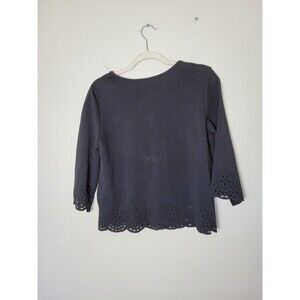Super cute Boxy fit Blouse top in a crepe material and laser cut lace trim hem and sleeves. Slightly cropped length and ¾ length sleeves. Good condition. Tagged size medium measures approximately 22 inches long and 19 inches underarm to underarm laid flat.